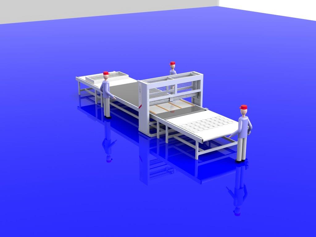AUTOMATIC PRESSING SYSTEM: AFTER THE GLUE BRIDGE, THE MATTRESS GOES TO THE PRESS AND THEN BONDED WITH FELT, FOAM, AND QUILTED PANEL. PRESSING SYSTEM IS PNEUMATIC.